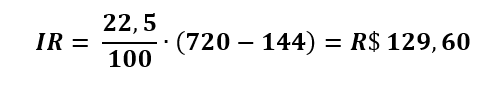 8 – IR: O próximo passo é o cálculo do Imposto de Renda que resulta R$ 129,60, conforme equação 10.