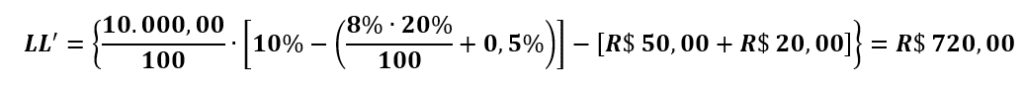 5 – LUCRO LÍQUIDO LIVRE DE TAXAS: A partir da equação 6 calculamos o LL’, que resulta R$ 720,00.