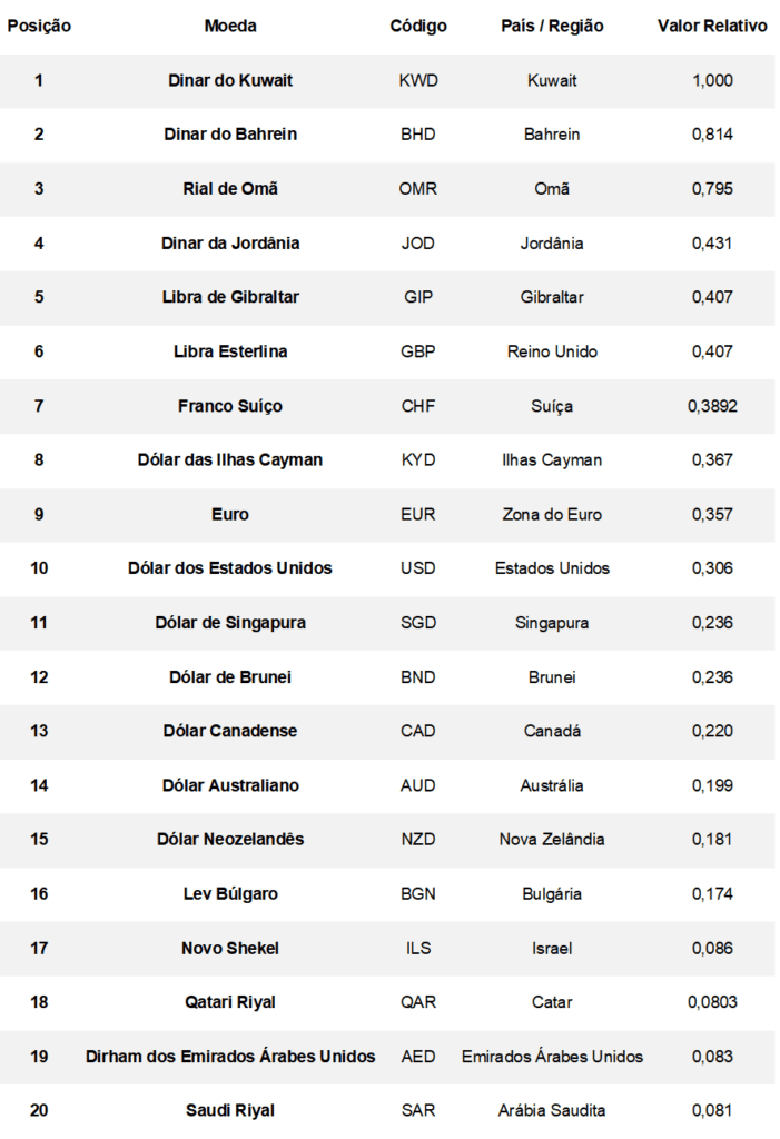 Outra observação importante, é o fato de países Árabes ocuparem as posições superiores da lista. Se você quiser entender esse fenômeno, os motivos que colocam os países Árabes nas posições superiores quanto ao Valor da Moeda, Clique Aqui.
