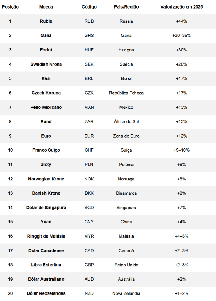 Segue a relação das Moedas que mais valorizaram no ano de 2025, com relação ao ano de 2024. Nesse período houve desvalorização do Dólar Americano.