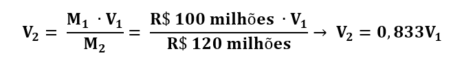O resultado indica que V2 é 83,33% de V1 . Ou seja, a Velocidade do Dinheiro, neste novo cenário, se reduz em torno de 16,67% (= 1 – 0,833).