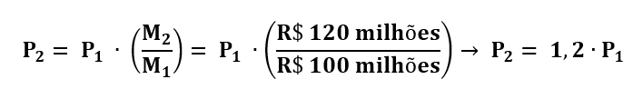 Comentário: Isso indica inflação de 20%. Esta análise é clássica para a Teoria Quantitativa da Moeda. O resultado mostra, na visão dos Monetaristas (Escola Monetarista), que a “produção artificial de moeda” por parte do governo gera inflação. Isso ocorre porque há aumento de dinheiro sem aumento da produção.