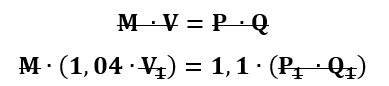 Comentário: A marcha de cálculos nos permite compreender que apenas um aumento de 4% na Velocidade do Dinheiro não é o suficiente para um aumento de 10% no PIB (= (PQ)2); sendo necessário que o binômio “PQ” tenha sua contribuição. Isso ocorre com o percentual de 5,77% para esse binômio. Como o preço é tido como inalterado, a produção “Q” deve aumentar em 5,77%. Assim, com um aumento de “V” de 4% e com um aumento de 5,77% na Produção “Q”, o PIB vai crescer 10%, no período de análise.